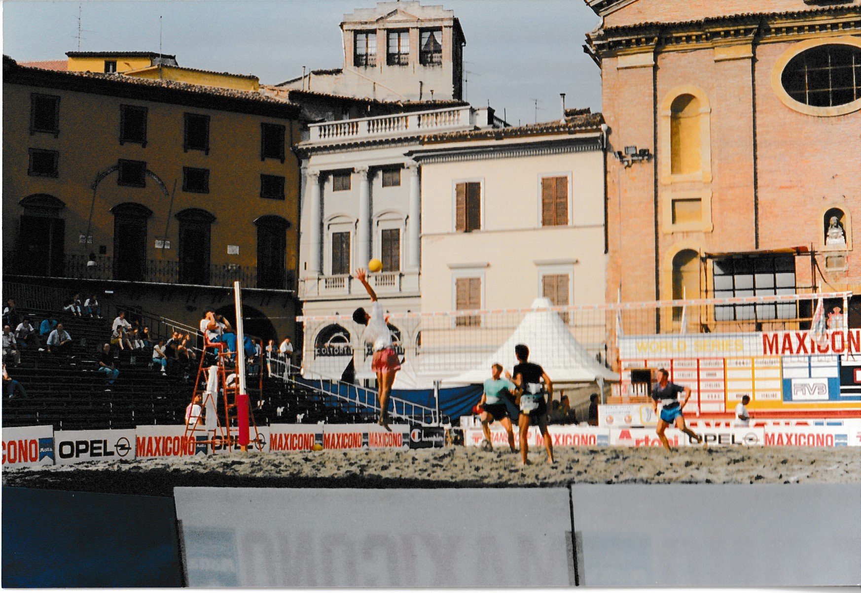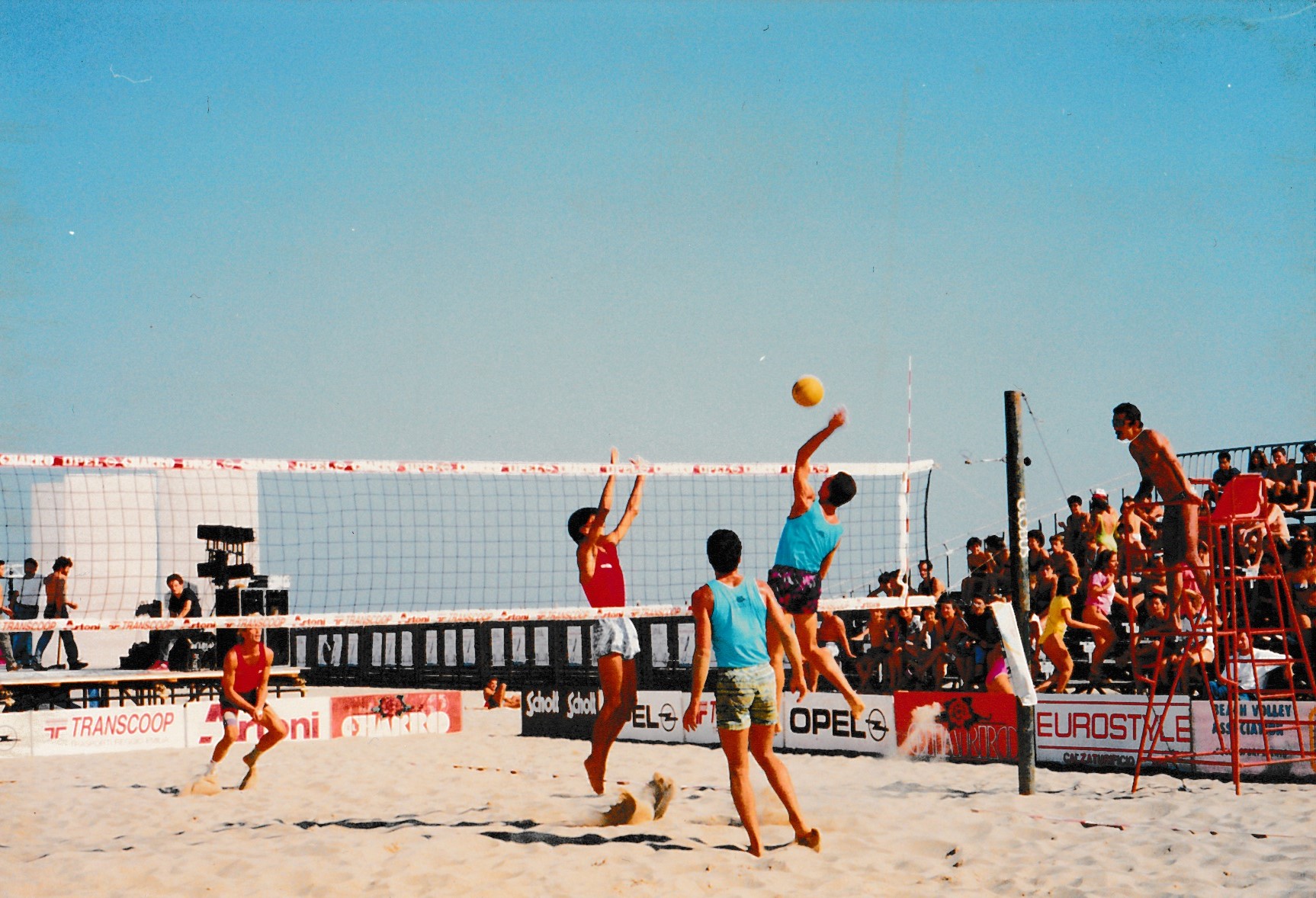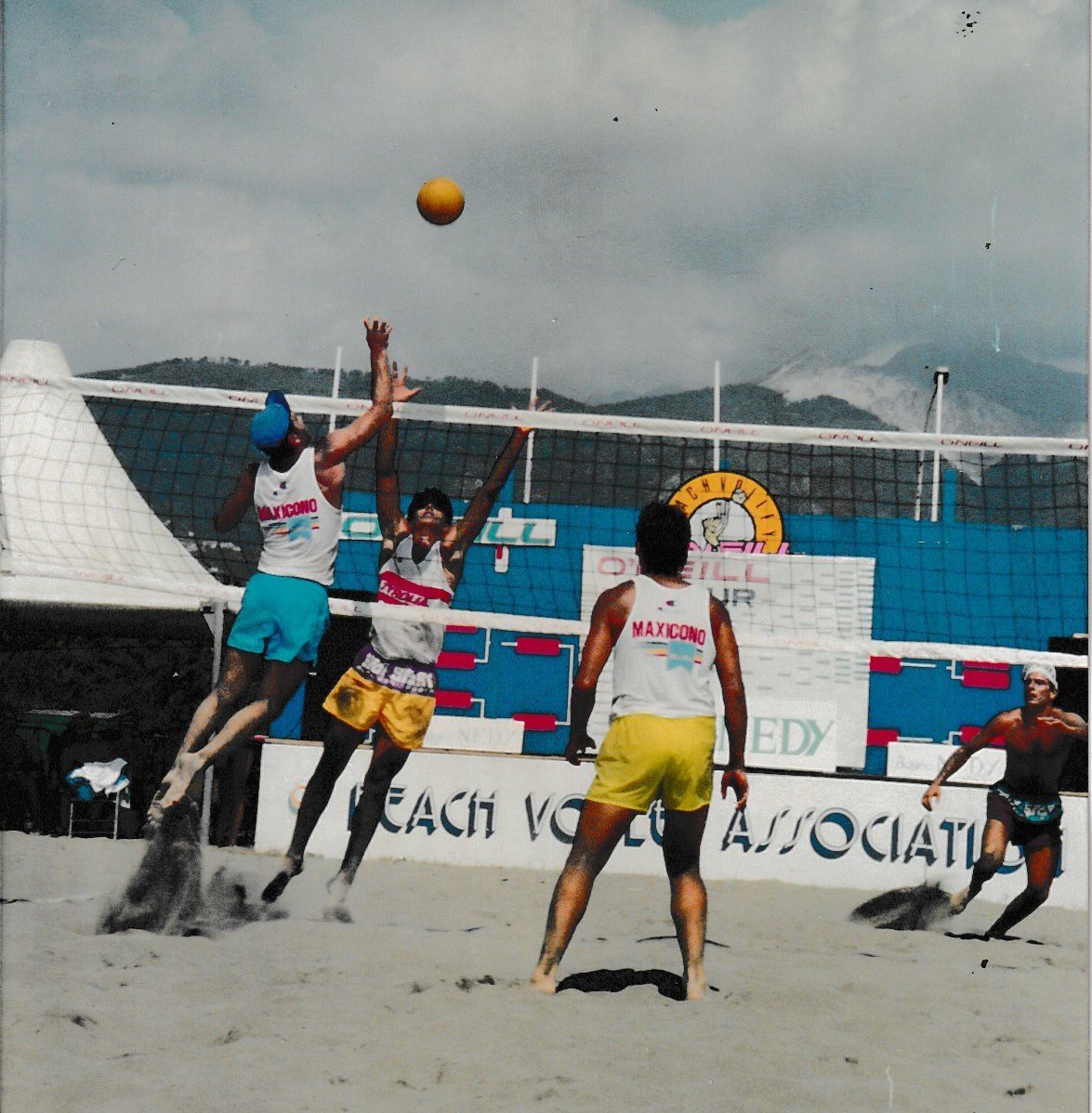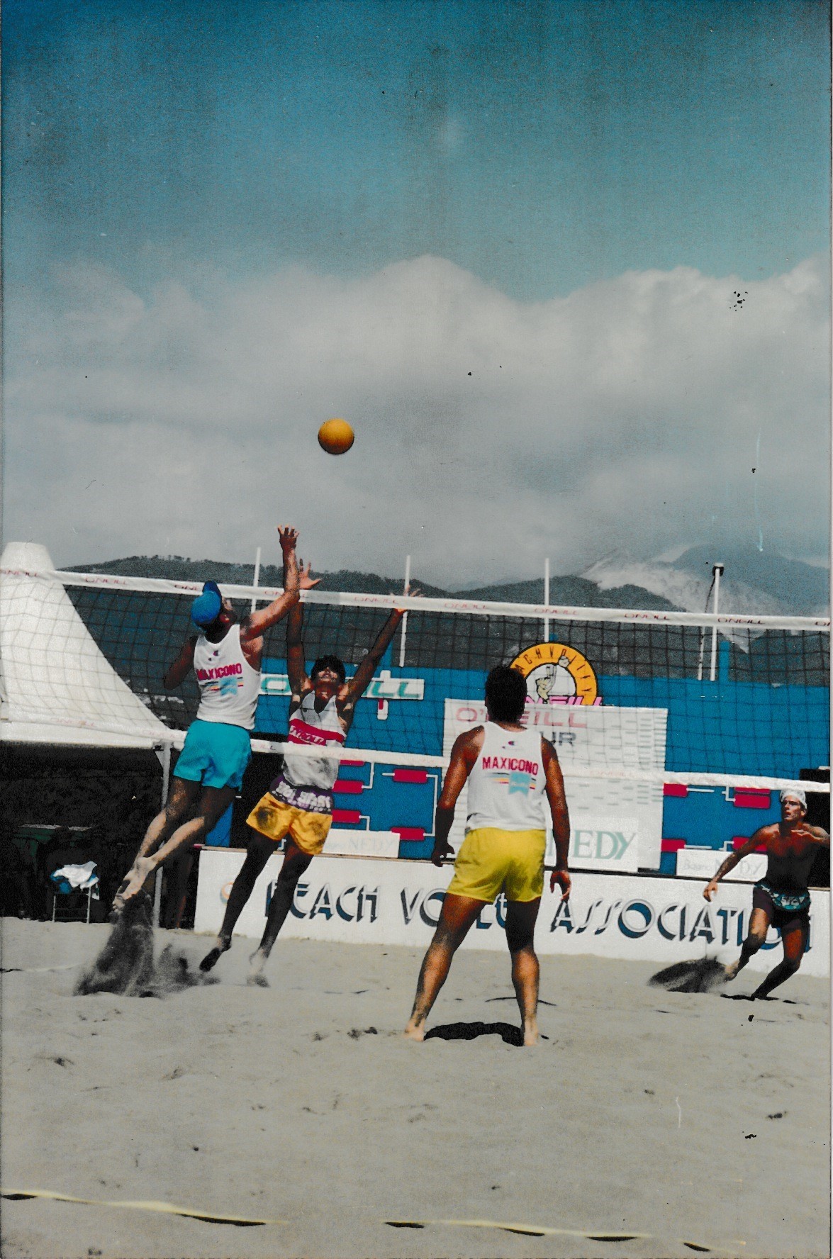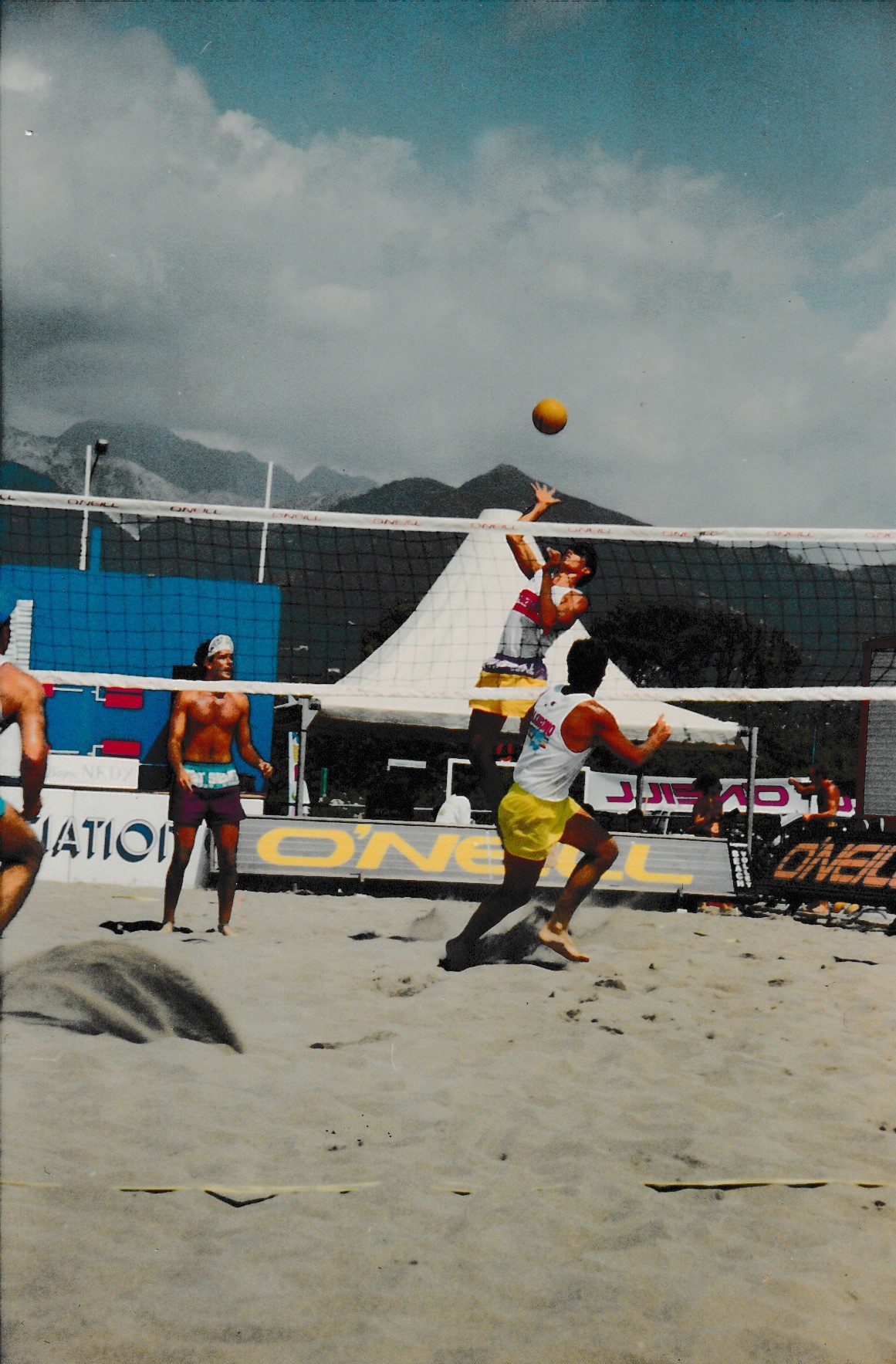 Ein Trainingsspiel vor dem ersten offiziellem FIVB World Series Turnier in Jesi 1989: Gemeinsam mit Dionisio Lequaglie (I) gegen die legendären Sinjin Smith und Randy Stoklos (USA), dem späteren Turniersieger. Wir haben ehrenvoll etwa 15:12 verloren.